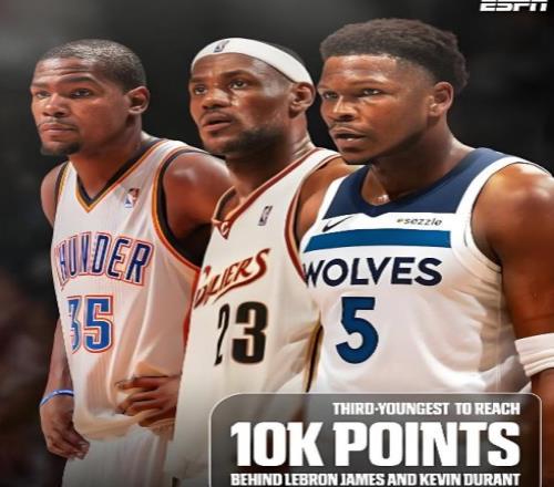詹姆斯在23歲59天時得到10000分,杜蘭特則是在24歲33天,科比是24歲194天;至于愛德華茲,在對騎士的比賽中得到他第23分時,以24歲156天扣開10000 分,比科比快了38天。
