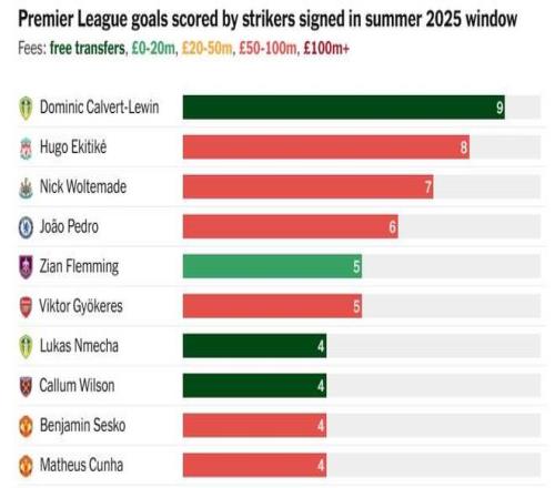根據(jù)The Athletic的統(tǒng)計數(shù)據(jù),在去年夏窗英超各隊引進(jìn)的中鋒當(dāng)中,勒溫是在英超當(dāng)中進(jìn)球最多的,?;倏伺琶诙?,沃爾特馬德第三。