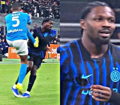 第二件事,就是在網(wǎng)友當(dāng)中爭論較多的小胡安飛踹小圖拉姆事件,抬腳過高首先至少是一張黃牌;而小胡安卻又在空中不收腳,反而二次發(fā)力有力量的蹬了出去,直接把小圖拉姆的球衣都蹬破了;那么從慢動作來看,這不但應(yīng)該是一張直紅的動作,而且應(yīng)該被判定為違反體育道德的球場暴力行為,賽后應(yīng)該被追加停賽處罰的;但主裁判判罰的是擲邊線球,直紅動作在這里居然連犯規(guī)都不是;同樣,賽后意大利媒體圈,沒有任何人提及此事,是任何人。