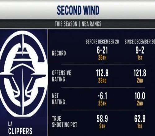 勢(shì)不可擋,自盧在快船6勝21負(fù)宣布“北伐”后,快船已10勝2負(fù)