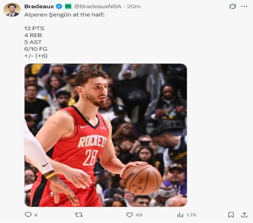 上半場申京10中6,拿到13分5助攻4籃板,正負值+6,第二節(jié)在火箭全隊低迷的情況下他單節(jié)4中4拿到9分3籃板1助攻,申京依舊是火箭第一核心。
