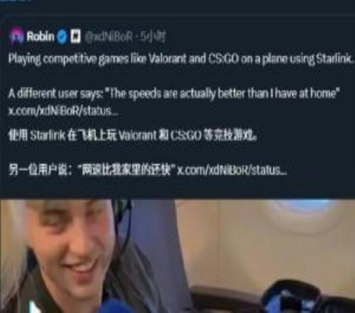 電競體育1月16報道 馬斯克轉(zhuǎn)載用戶在飛機上使用星鏈體驗無畏契約和CS的視頻,視頻中用戶表示除了能夠流暢游戲外,網(wǎng)速甚至比家里還快。