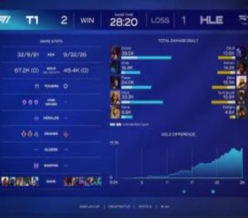 電競(jìng)體育1月16報(bào)道 LCK杯T1二比一擊敗HLE,賽后決勝局?jǐn)?shù)據(jù)面板,Doran阿卡麗打出的全局傷害大于Zeka沙皇+Gumayusi燼的傷害總和。
