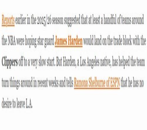 北京時(shí)間1月17日,2025-26賽季初期曾有報(bào)道稱(chēng),由于快船隊(duì)開(kāi)局戰(zhàn)績(jī)慘淡,聯(lián)盟中至少有幾支球隊(duì)都盼著當(dāng)家后衛(wèi)哈登能被擺上交易貨架。但身為洛杉磯本地人的哈登,在過(guò)去幾周助力球隊(duì)扭轉(zhuǎn)頹勢(shì),他在接受ESPN采訪(fǎng)時(shí)明確表示,自己毫無(wú)離開(kāi)洛杉磯的念頭。