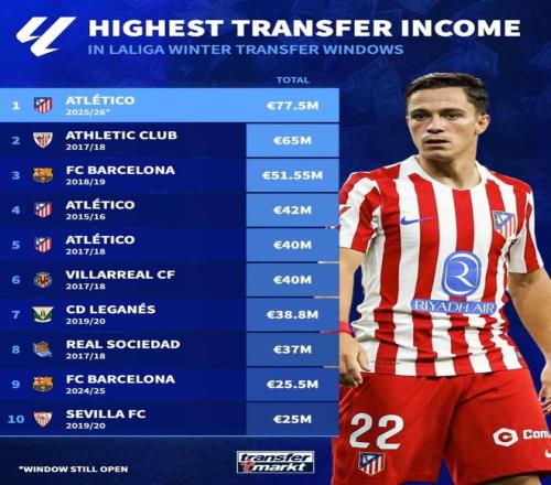德轉(zhuǎn)列西甲歷史冬窗轉(zhuǎn)會(huì)收入榜:本賽季馬競7750萬歐元第1