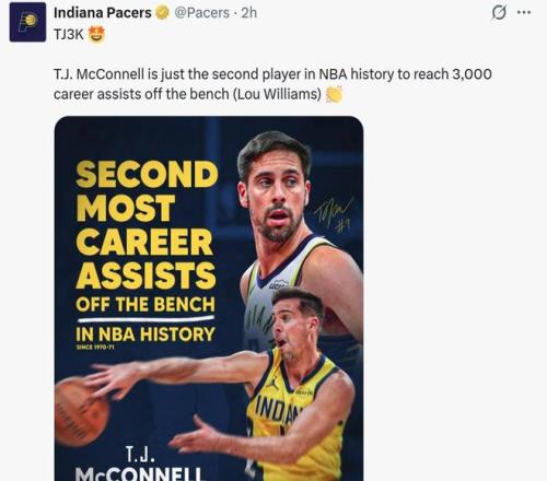 同為落選秀的TJ麥康奈爾也是在加盟步行者隊(duì)后打出名堂,本場TJ麥康奈爾8中4拿下8分2板的同時(shí)送出9次助攻,成為NBA歷史上第二位以替補(bǔ)身份送出至少3000次助攻的球員,第一位是超六路威。