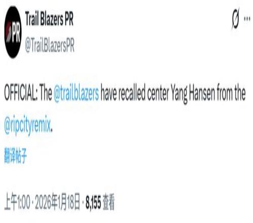 開(kāi)拓者官宣召回楊瀚森!今日有望出戰(zhàn)湖人近兩場(chǎng)G聯(lián)賽場(chǎng)均18+12