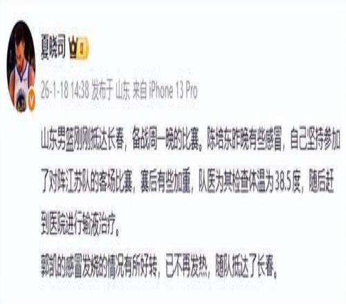 不過,山東男籃還是遇上了新麻煩,根據(jù)山東媒體人夏曉司的報(bào)道,山東男籃陣中兩大核心都出現(xiàn)了感冒,一個(gè)是陳培東,他帶病堅(jiān)持打了對陣江蘇隊(duì)的比賽,可惜效果不佳。由于是帶病出戰(zhàn),賽后,陳培東的感冒加重,體溫飆升到了38.5度,只能趕到醫(yī)院輸液。如此來看,陳培東大概率是要缺席對陣吉林隊(duì)的比賽了。