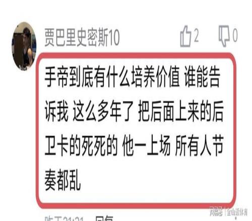 “手帝打成這樣,還用,就不能上虎子何大牙?楊鳴水平呀”;“手帝到底有什么培養(yǎng)價(jià)值 誰(shuí)能告訴我 這么多年了 把后面上來(lái)的后衛(wèi)卡的死死的 他一上場(chǎng) 所有人節(jié)奏都亂”……