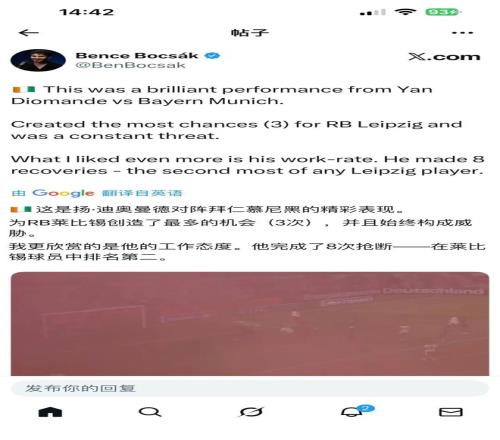 迪奧曼德剛從非洲杯回來,對陣拜仁慕尼黑就有了精彩表現(xiàn)。為RB萊比錫創(chuàng)造了最多的機(jī)會(3次),更被欣賞的是他的工作態(tài)度,他完成了8次搶斷:在萊比錫球員中排名第二。