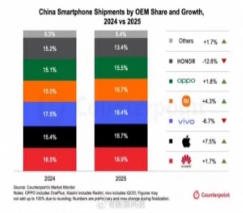 電競體育1月19報道 Counterpoint Research 在今日發(fā)布的新聞稿中表示,中國智能手機市場 2025 年第四季度出貨量同比減少 1.6%,而 2025 年全年的出貨則減少了 0.5%。