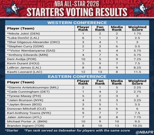 東契奇在球迷投票中排名第1,成為今年的全明星票王。但他在球員投票中僅排第6,媒體投票中排名第2,最終位列西部第2。約基奇在球迷投票中排西部第2,媒體投票也排第2,但他在球員投票排第1,最終力壓東契奇高居西部第1。