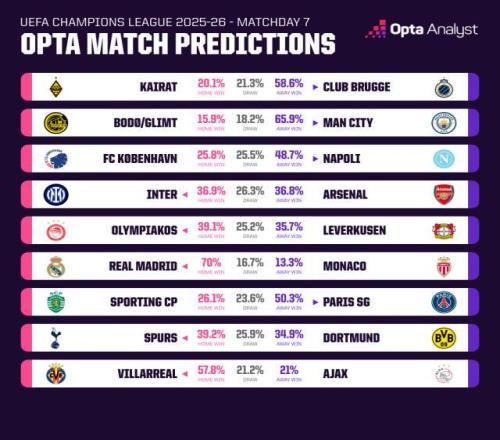 考慮到諸多因素,Opta的超級(jí)計(jì)算機(jī)為這場(chǎng)重頭戲推演出了“勢(shì)均力敵”的結(jié)果。國(guó)米主場(chǎng)贏球的概率達(dá)到36.9%,阿森納則是36.8%,余下26.3%的模擬數(shù)據(jù)是平局。這里補(bǔ)充一句,聯(lián)賽階段還有兩輪,槍手本輪的客場(chǎng)對(duì)手強(qiáng),下輪要主場(chǎng)迎戰(zhàn)的卻是魚腩——哈薩克斯坦球隊(duì)阿拉木圖凱拉特前6輪只拿到1分,打進(jìn)4球但被破門15次。