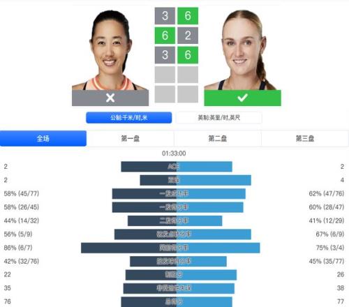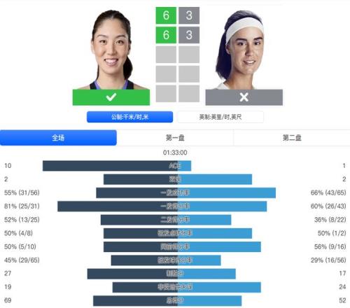 面對從資格賽打上來的卡利尼娜,王欣瑜此役交出了完美數(shù)據(jù):超過8成的一發(fā)得分率,4次破發(fā),27個制勝分。比賽過程一路順風,僅耗時1小時33分鐘便拿下勝利。下一輪她將和前法網(wǎng)女單冠軍奧斯塔彭科隔網(wǎng)相對。