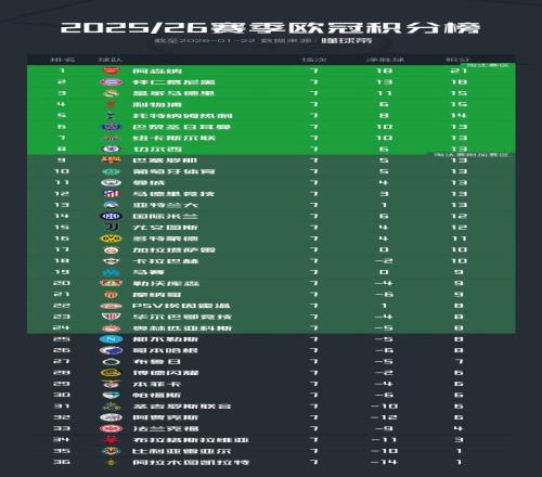 25/26賽季歐冠聯(lián)賽階段積分榜