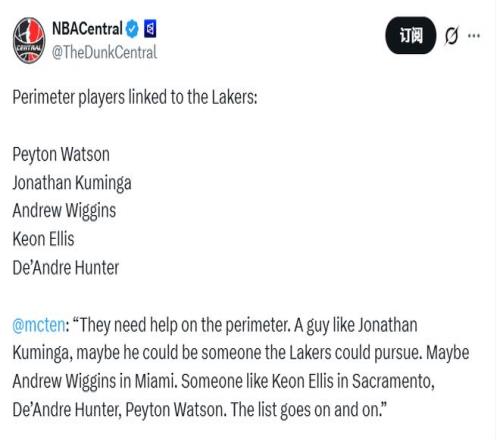 “湖人的外線急需補強。像喬納森-庫明加這樣的球員,或許會是球隊的追逐目標。還有可能是在邁阿密效力的安德魯-維金斯。另外,薩克拉門托的基翁-埃利斯,以及德安德烈-亨特、佩頓-沃特森等人也在備選之列。這份潛在引援名單還有很長?!?/p>