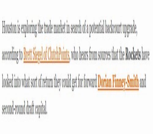 北京時間1月23日,據(jù)名記西格爾報道,休斯頓火箭隊正試水交易市場,尋求補(bǔ)強(qiáng)球隊后場實力。消息人士透露,火箭方面已在評估,若將鋒線球員芬尼-史密斯與次輪選秀權(quán)作為籌碼,能夠換回怎樣的交易回報。