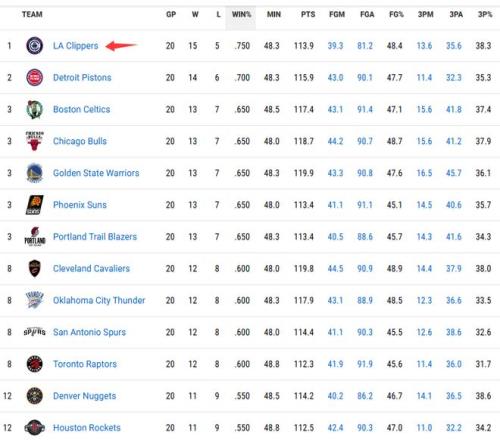 近20場勝率排名:快船居首勇士開拓者并列第3雷霆第8火箭第12
