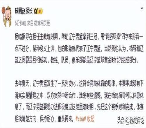 隨后,楊鳴社媒發(fā)文表示:最近球隊(duì)的表現(xiàn)真心對不住球迷們的支持,讓大家很失望,我非常內(nèi)疚和慚愧,感謝所有隊(duì)員們對我的支持,感謝俱樂部一直的信任。遼寧籃球一定會越來越好,加油。