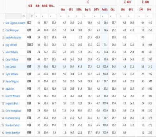 雷霆全隊16人除了亞歷山大三分受助攻率不足30%外,其余人都在60%以上,幾位首發(fā)受助攻率更是飆到77%以上。從這一點可以看出,雷霆進攻真正有威脅的點只有亞歷山大,其他人都是他的掛件幫他拉進攻空間。反觀73勝勇士,庫里只是一個相對有把握的得分終結點。湯普森、伊戈達拉甚至巴恩斯都能自主持球單打且每回合能拿到0.9分,雖然算不上精英持球攻擊手但具備個人進攻威脅。而雷霆除了亞歷山大其他人不僅沒特別強持球進攻威脅,也沒有足夠強的單打欲望。這也是雷霆和73勝勇士進攻端最大差別。