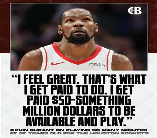 賽前杜蘭特談到自己37歲高齡還場均打36.9分鐘,他表示:我感覺很棒,這就是我的工作意義所在,我拿著5000多萬的薪水就是要在賽場拼搏,我每晚都準備打48分鐘,如果能完成這個要求我就滿足了。