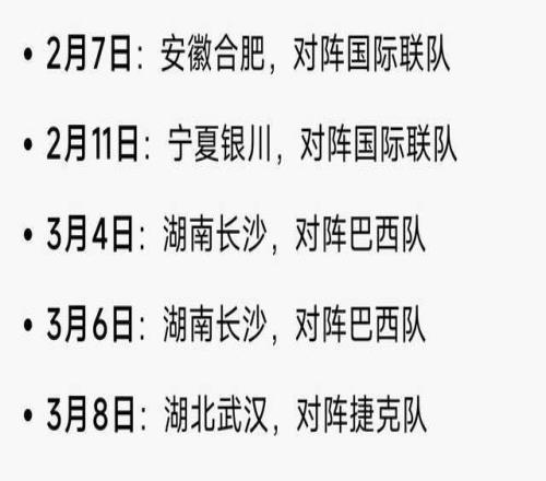 2月、3月的五場熱身賽時間如下:
