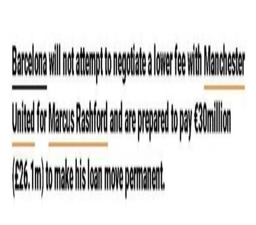 據(jù)西班牙《每日體育報》報道,巴薩放棄嘗試與曼聯(lián)就拉什福德的轉(zhuǎn)會費(fèi)進(jìn)行談判,他們準(zhǔn)備支付3000萬歐元(2610萬英鎊)的買斷金額,將他的租借轉(zhuǎn)為永久轉(zhuǎn)會。