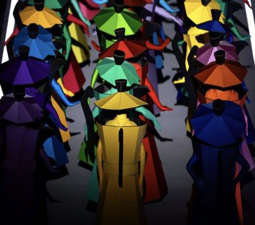 到了現(xiàn)代,我以為沖鋒衣要出場了,沒想到突然開始搞抽象,一群銀色的外星人開始翩翩起舞。