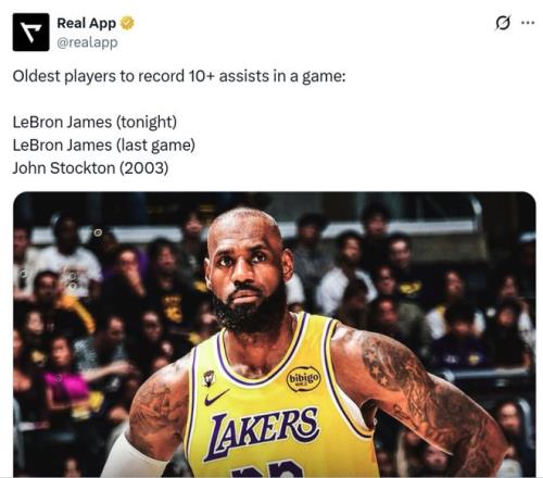 憑借這樣的表現(xiàn),41歲零40天的詹姆斯超越上一場(chǎng)的自己,成為NBA歷史上單場(chǎng)送出至少10次助攻最老的球員。