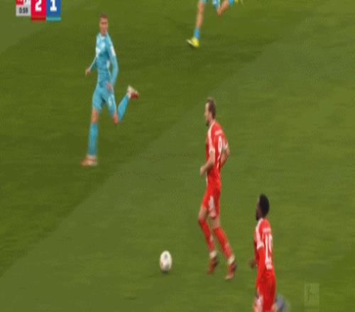 第45分鐘,迪亞斯再造點,凱恩點射雙響,拜仁2-1霍芬海姆