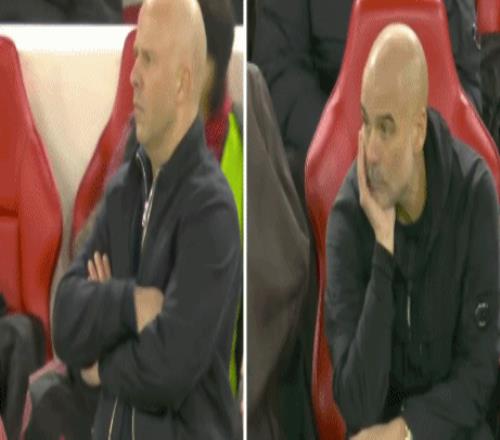 此時(shí),鏡頭來到場(chǎng)邊的兩位光頭主帥,反應(yīng)可謂截然不同。斯洛特?fù)]拳轉(zhuǎn)身慶祝,瓜迪奧拉一臉無奈!