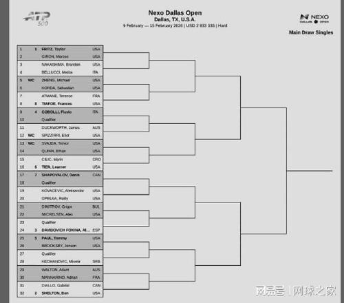 我們再來關(guān)注其它消息。北京時間昨天,本周的兩站ATP巡回賽相繼公布了正賽簽表。ATP500美國達拉斯公開賽,兩位本土名將弗里茨、謝爾頓位列前兩號種子,衛(wèi)冕冠軍是加拿大名將沙波瓦洛夫。