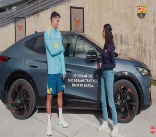 我們現(xiàn)在坐在一輛CUPRA里,這很特別,因?yàn)檐嚿嫌幸痪鋵iT為你準(zhǔn)備的貼紙。如果你愿意,可以對(duì)著巴薩球迷大聲讀出來(lái)。