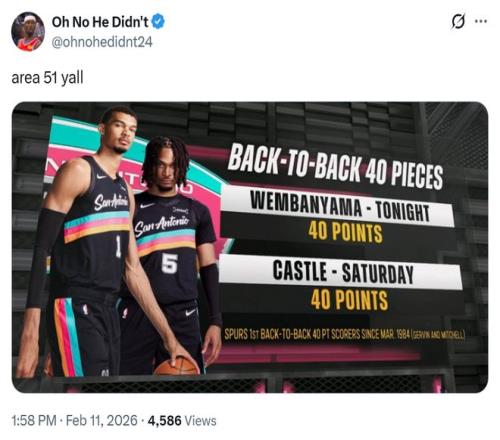 因?yàn)椴粌H是文班,卡斯?fàn)枴⒐昱c卡特布萊恩特三大新星的表現(xiàn)也是可圈可點(diǎn),過(guò)去兩場(chǎng)文班與卡斯?fàn)栠B續(xù)砍下40+成為馬刺自1984年格文和邁克-米切爾后,首對(duì)在連場(chǎng)砍下40+的雙人組。