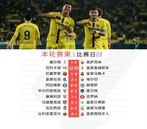 隨著今日凌晨比利亞雷亞爾4比1大勝西班牙人,除開巴列卡諾對陣皇家奧維耶多的比賽延期外,西甲第23輪的其余九場比賽全部戰(zhàn)罷。積分榜方面,巴塞羅那、皇家馬德里雙雙取勝,前者仍然以1分優(yōu)勢領跑西甲聯(lián)賽;馬競本輪0比1不敵皇家貝蒂斯,盡管多賽一場,但積分已被身后的比利亞雷亞爾追平,皇家貝蒂斯則緊隨其后、位列歐聯(lián)區(qū)。