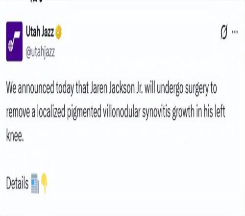 北京時(shí)間2月13日,猶他爵士隊(duì)官方宣布,小賈倫-杰克遜將接受手術(shù),移除其左膝內(nèi)一處局部色素沉著絨毛結(jié)節(jié)性滑膜炎(PVNS)增生。該增生是在交易后的體檢中通過核磁共振檢查發(fā)現(xiàn)的。
