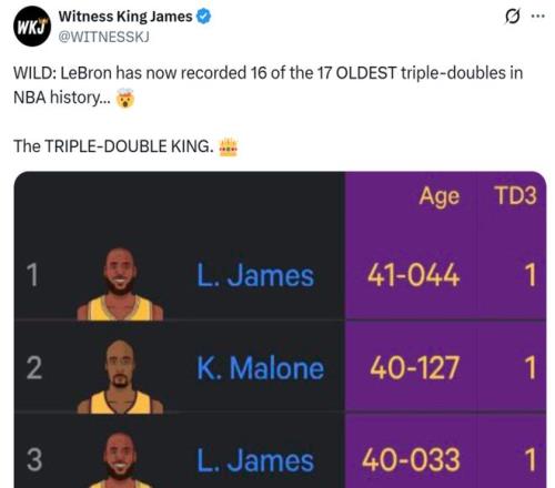 打破這一紀(jì)錄之后,在NBA歷史前17老的三雙榜單中,詹姆斯一人獨(dú)占夸張的16席。