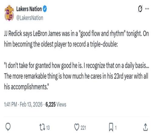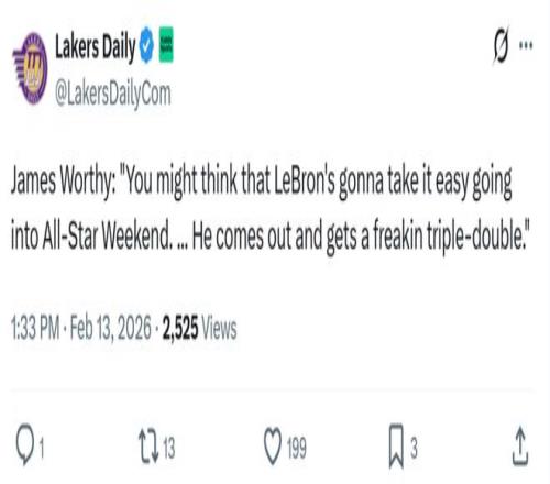 面對(duì)詹姆斯如此傲人的表現(xiàn),湖人名宿沃西感嘆道:“當(dāng)你認(rèn)為詹姆斯可能會(huì)在全明星周末到來(lái)之際放松一下時(shí),結(jié)果他一上場(chǎng)就拿了個(gè)三雙?!?/p>