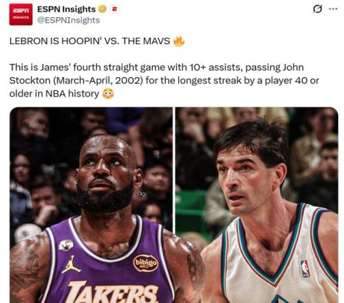 紀(jì)錄一:本場(chǎng)是詹姆斯連續(xù)第4場(chǎng)助攻數(shù)上雙,成功超越NBA助攻王斯托克頓,刷新NBA歷史上40歲及以上球員助攻連續(xù)上雙場(chǎng)次最長(zhǎng)紀(jì)錄。