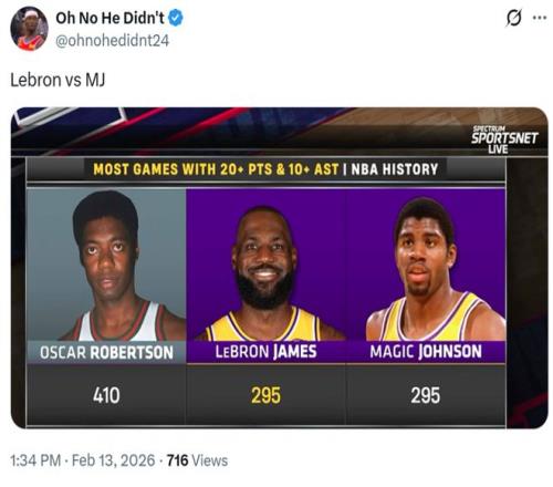 紀(jì)錄三:本場(chǎng)是詹姆斯生涯第295次單場(chǎng)至少交出20分10助,成功追平魔術(shù)師約翰遜并列NBA歷史第二,大O以410次高居歷史第一。