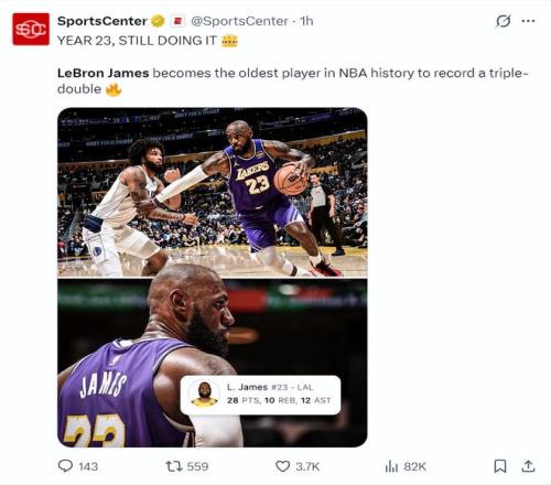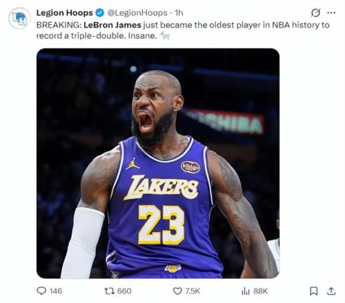 美媒LH寫道勒布朗成為歷史最年長的三雙球員,GOAT。