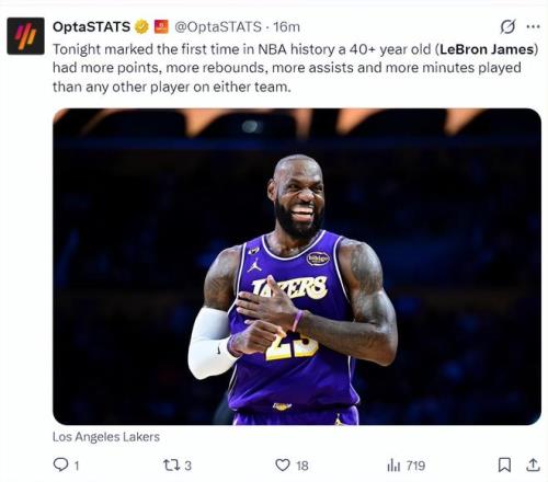 數(shù)據(jù)媒體Statmuse寫道:詹姆斯從最年長單場25+、單場30+、單場35+、單場40+到單場三雙。勒布朗-詹姆斯自最年輕的紀錄到最年長紀錄都統(tǒng)治了一個遍。