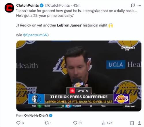 雷迪克賽后談到詹姆斯:我從來沒有把勒布朗的表現(xiàn)當成理所當然,但我每天都有切實的感受,他仍處于職業(yè)生涯的巔峰期,他已經(jīng)在巔峰23年之久了。
