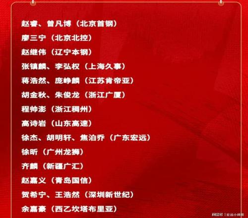 在第一階段常規(guī)賽結(jié)束后,中國籃協(xié)就官宣了這次國家隊的集訓(xùn)名單,分別是:趙睿,曾凡博,廖三寧,趙繼偉,張鎮(zhèn)麟,李弘權(quán),蔣浩然,龐崢麟,胡金秋,朱俊龍,程帥澎,高詩巖,徐杰,胡明軒,焦泊喬,徐昕,齊麟,趙嘉義,賀希寧,王浩然,余嘉豪。