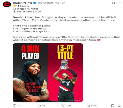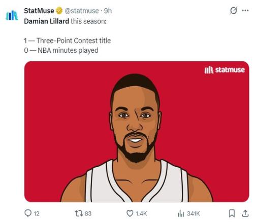 除此之外利拉德還創(chuàng)造了一項NBA歷史首人紀(jì)錄,他在本賽季還未出戰(zhàn)過任何一分鐘,卻拿到了三分大賽的冠軍,他是歷史首位做到的NBA球員。