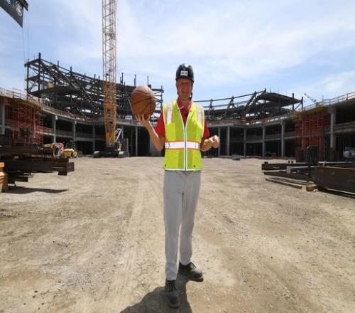 2022年8月的一天,史蒂夫-鮑爾默頭戴黑色建筑安全帽,身穿黃色安全背心,站在工地上的裝卸站臺區(qū)域。當(dāng)時球館區(qū)域的土地還不太平坦,但他完全清楚這里的相關(guān)布局,甚至可以準(zhǔn)確指出客隊更衣室未來的位置。