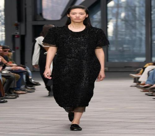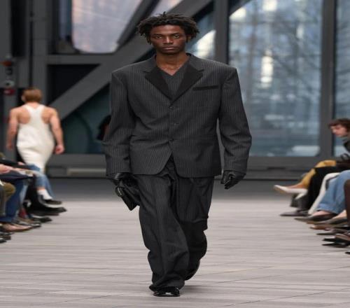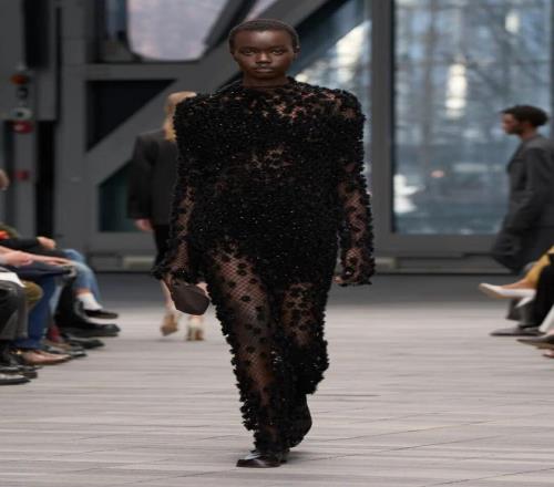 系列開場由黑白簡約的服飾引領(lǐng),細節(jié)經(jīng)過簡化處理,黑色西裝采用同色條紋,窄小的翻領(lǐng)設(shè)計加以點綴;而一條無肩帶、結(jié)構(gòu)感十足的黑色裙子,幾乎無縫貼合身形,展現(xiàn)出極簡美學的精髓。接下來的羊毛外套、全皮西裝、羊毛和皮革領(lǐng)口等,逐漸將氛圍推向奢華享受。整體系列既有簡潔的建筑感,也有豪華質(zhì)感的柔美面料,反映出 Leoni 對 Calvin Klein 歷史遺產(chǎn)的獨特理解與延續(xù)。