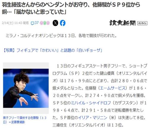佐藤駿跟羽生結(jié)弦一樣是仙臺(tái)人,他小時(shí)候就是因?yàn)槌绨萦鹕Y(jié)弦才進(jìn)入的花滑世界。賽后他表示從羽生前輩那里得到的吊墜代替了護(hù)身符陪伴在身邊,在前幾天短節(jié)目失誤后也是看著前輩的傳奇表演“晴明”受到鼓舞才拿下的這枚銅牌。