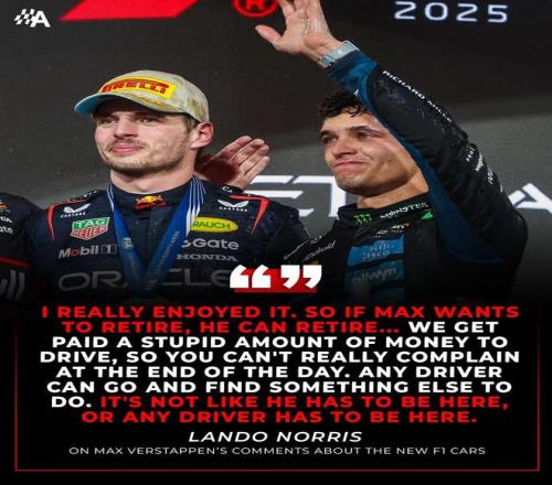 對于維斯塔潘的不滿,諾里斯回應(yīng)道:“其實他也不是非得留在這里,或者說,其實沒有哪位車手是非留不可的。如果維斯塔潘認(rèn)為當(dāng)前的規(guī)則無法使他盡興,他當(dāng)然可以選擇退役離開。”這番針鋒相對的言論在中外網(wǎng)絡(luò)上激起了廣泛討論,無疑為新賽季的冠軍爭奪增添了火藥味。