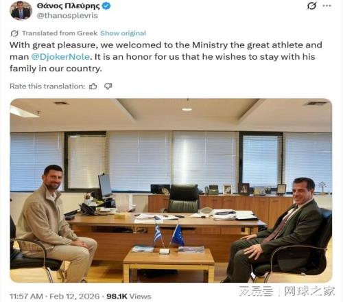周四,希臘移民與庇護(hù)部長Thanos Plevris在X(原Twitter)上發(fā)文稱,德約科維奇“希望與家人留在我們國家”,并分享了自己與這位塞爾維亞球星合影的照片,“我們非常高興在部里歡迎這位偉大的運(yùn)動員和杰出的人,他希望與家人留在我們國家,這對我們來說是一種榮幸?!?/p>